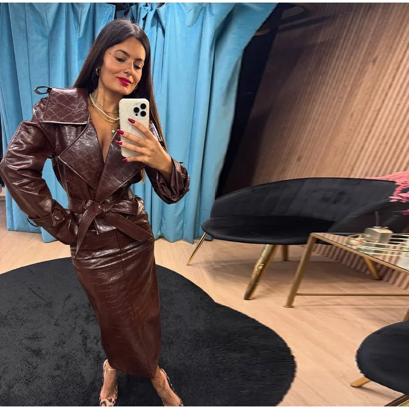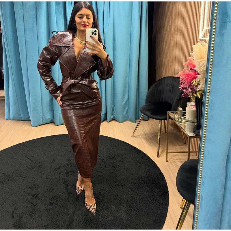 Crafted from premium, high-shine faux croc-effect leather in a rich, decadent Deep Brown (ou Deep Burgundy) hue. This two-piece set features a sculpted Trench Coat with oversized cuffs and a dramatic self-tie belt that cinches your waist for an enviable hourglass silhouette. Paired with a sleek matching pencil skirt, it's a look that screams high-fashion confidence. It’s the perfect blend of edgy texture and classic tailoring.